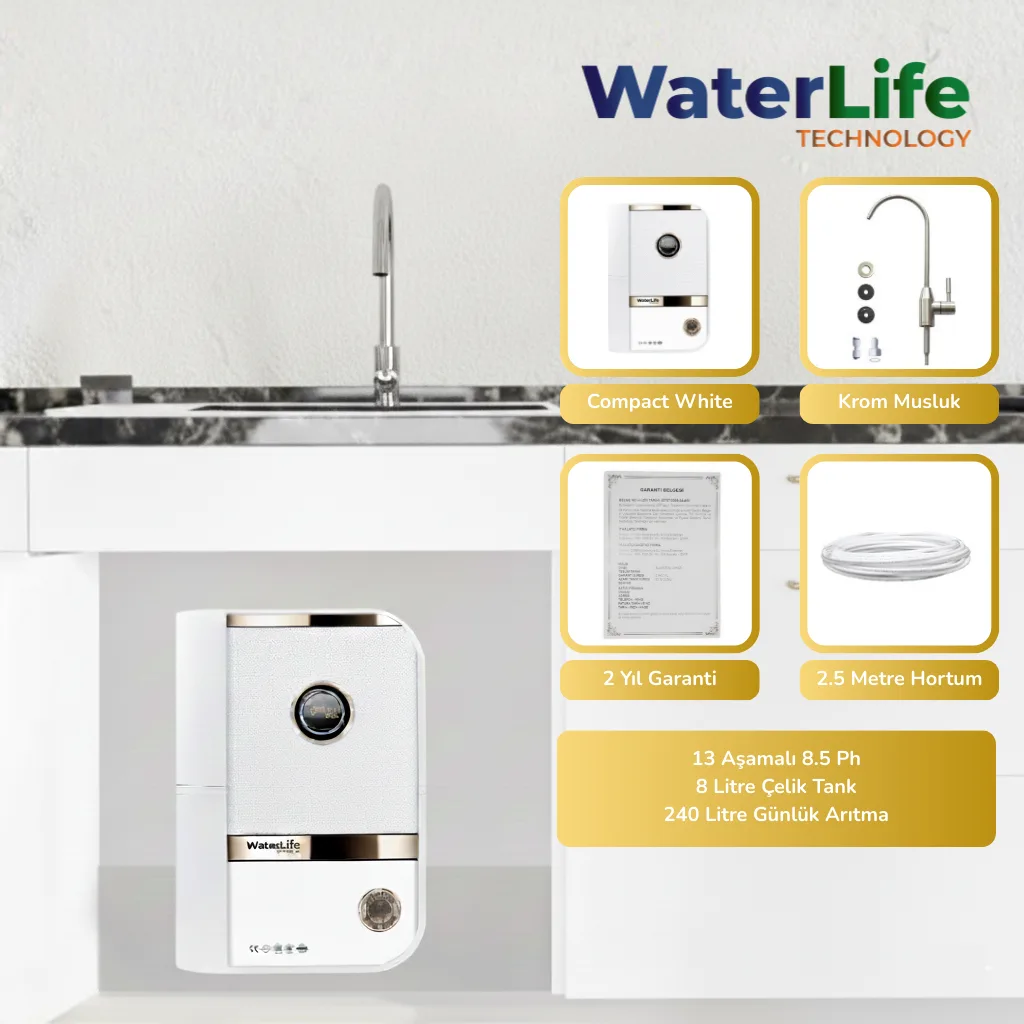 Waterlife Compact White, zarif ve modern çizgileriyle mutfaklara sade bir şıklık katarken, kompakt gövdesiyle dar alanlarda bile güçlü bir performans sunan su arıtma cihazıdır. Ev kullanıcıları için tasarlanan bu model, 13 aşamalı gelişmiş filtreleme sistemi sayesinde içme suyunu her zaman taze, güvenli ve keyifle içilebilir hale getirir.